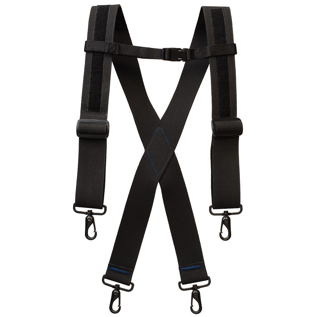 - A chest strap helps prevent suspenders from slipping